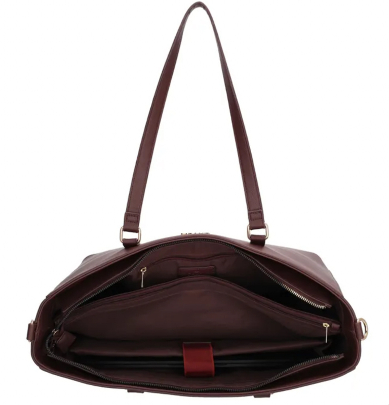 De tas heeft twee hengsels die goed over je jas passen. Maar ook een lange band. De tas sluit af met een rits. De binnenkant is gevoerd en heeft diverse vakjes. Echt een leuke tas die wat "harder" is, dus ook prima blijft staan. (Goed verhaal voor je boeken ;-) )