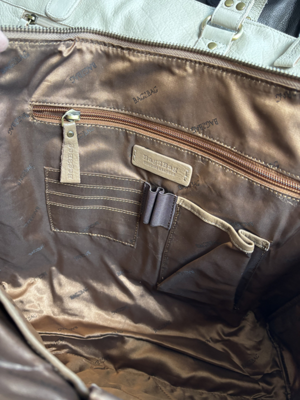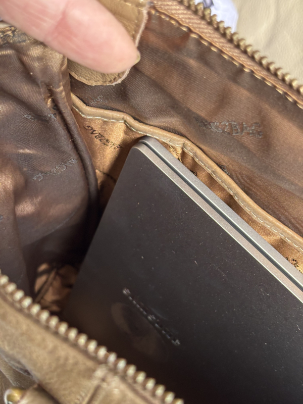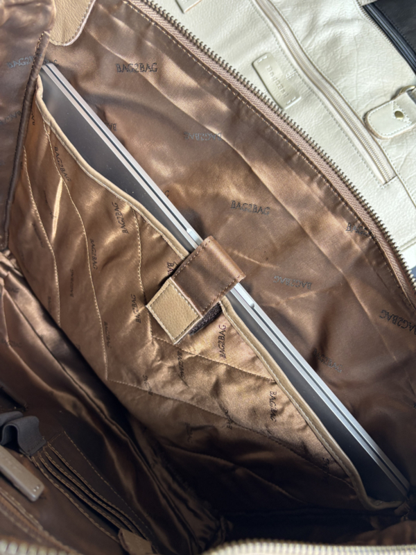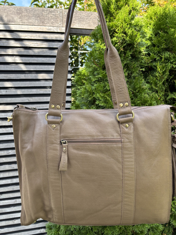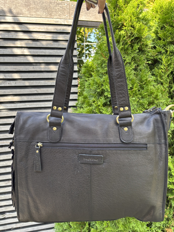 Elegante vrouwelijke werk tas met veel opberg mogelijkheden. Laptop vak met versteviging, afsluitbaar doormiddel van klittenband stripje. Aan de andere kant vakjes voor pasjes, een bril of telefoon en pennen. Zie foto. Open gedeelte voldoende ruimte voor A4 formaat ordner. Mocht je een grotere laptop hebben dan 15.4 inch, kun je deze in het grote vak kwijt, zie foto. (in een beschermende sleeve zou ik hem dan wel doen) Voorzijde met ritsvak. Achterzijde met ritsvak. Bovenkant sluit ook met een stevige metalen ritssluiting. Ruime maat hengsels, kunnen goed over de schouder. Afklikbare verstelbare lange schouderband. De kleur van de metalen gespen is geborsteld, mat goud. Erg mooi.