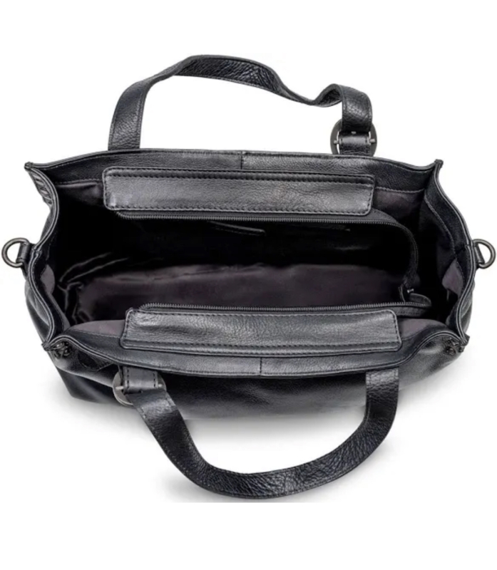 Binnenin biedt de tas een praktische indeling met een ruim hoofdvak, een extra ritsvak en meerdere steekvakken, zodat je je essentials overzichtelijk kunt meenemen.