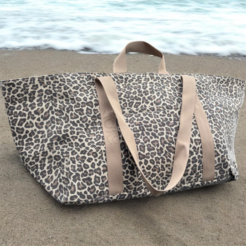 Super grote Shopper / Strandtas / weekendtas. Stevig katoen Canvas. Bruin panter.