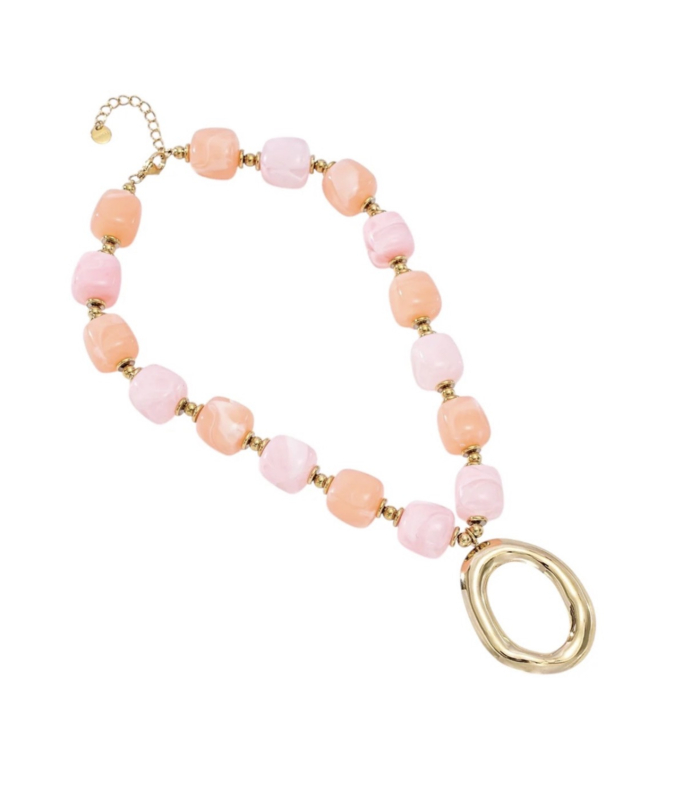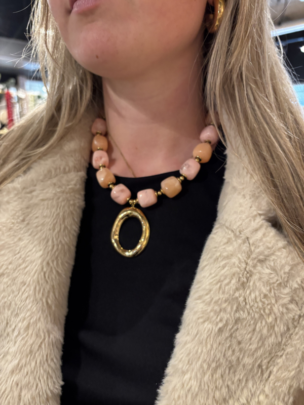 Ketting van 2 kleuren grove kraal met grote hanger van RVS (stainles steel). Goudkleurig. Zalmroze-roze
