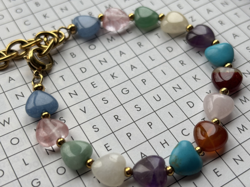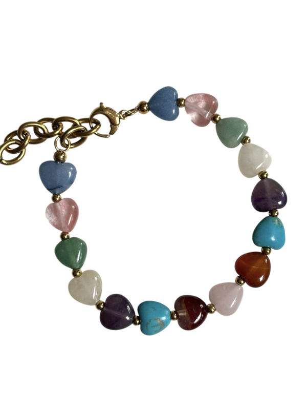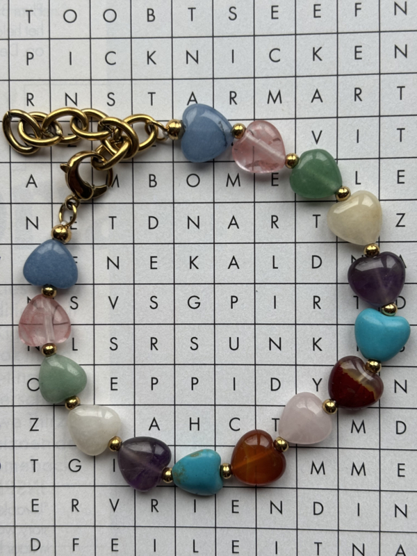 Natuursteen hartjes armband L-XXL met RVS (stainless steel) Goudkleurig