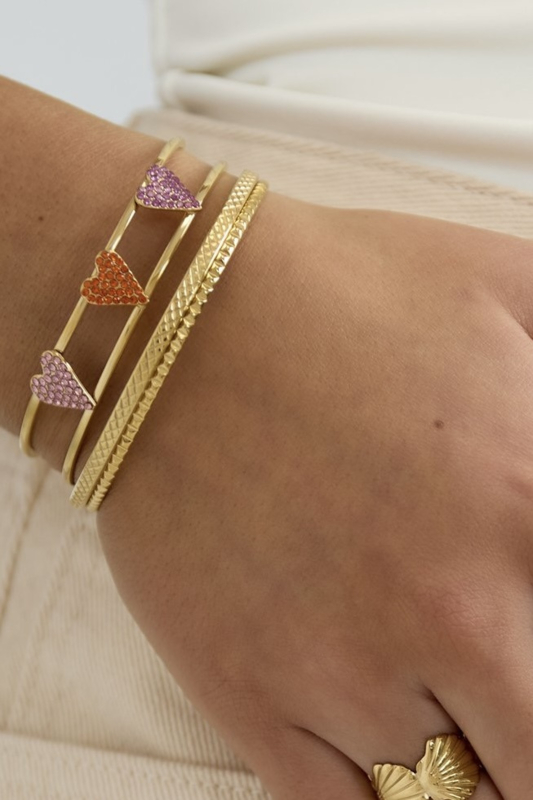 Onwijs gave dubbel laags open bangle (armband) met hierop 3 hartjes van strass in roze, oranje en lila.